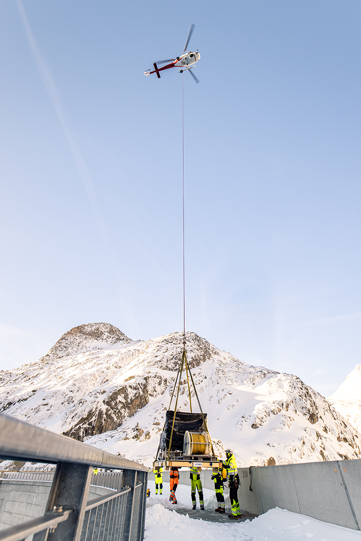 Mandatée pour ausculter les installations immergées d’Emosson, HYDRO a opéré un héliportage du poste de commande sur le couronnement avant de procéder à une inspection embarquée depuis un bateau.